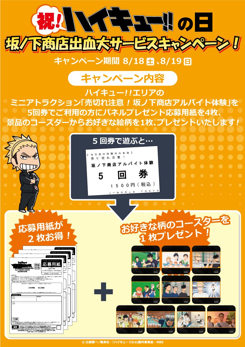 J World Tokyo Pa Twitter 祝 ハイキュー の日 ハイキュー の日をお祝いして J World では8 18 土 8 19 日 の2日間 ハイキュー エリアでキャンペーンを開催 5回券でミニアトラクションを遊ぶと パネルプレゼント応募用紙が4枚と好きな絵柄の