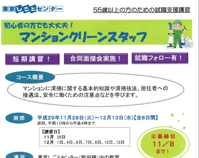 東京しごとセンター 就業相談 職業紹介 على تويتر マンションクリーンスタッフ 就職に有利 55歳以上の方へ 就職支援講習 受講は無料 テキスト代一部負担有 就職率80 をほこる講習会です 詳細はhpを T Co Ni7oamrdhu 転職 再就職 定年後