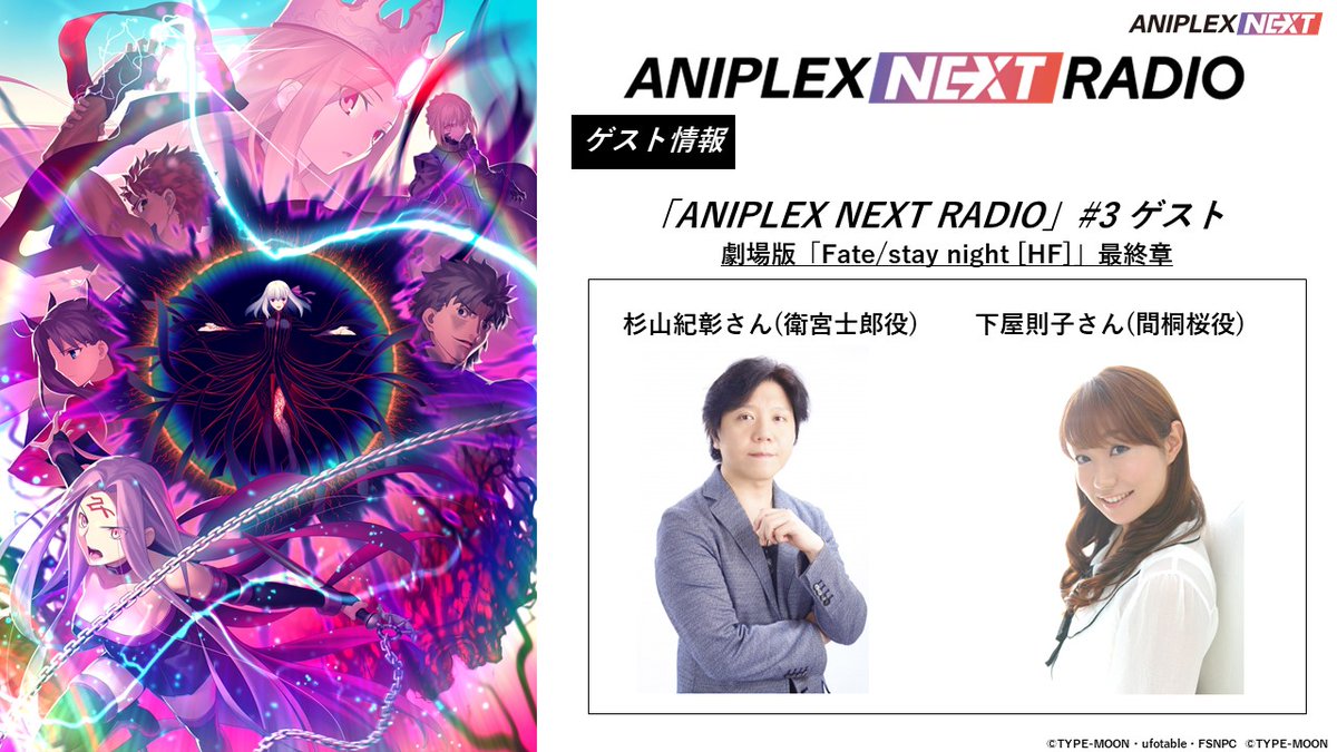 アニプレックスnext 公式 En Twitter アニプレックスnext ラジオ 第3回ゲストが決定 ゲスト 杉山紀彰 下屋則子 8 15 公開の劇場版 Fate Stay Night Hf 最終章についてお聞きしていきます お便りを現在募集中 採用された方には アニプレックスnext